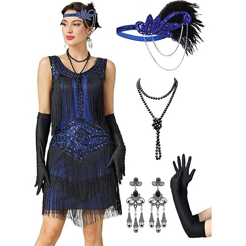 Set Retrò Vintage Anni Ruggenti Anni 1920 Lunghezza al ginocchio Abito Flapper Abito da cocktail Costume di fantasia con accessori Maniche corte Il grande Gatsby Ragazza Flapper Paillettes Frangia