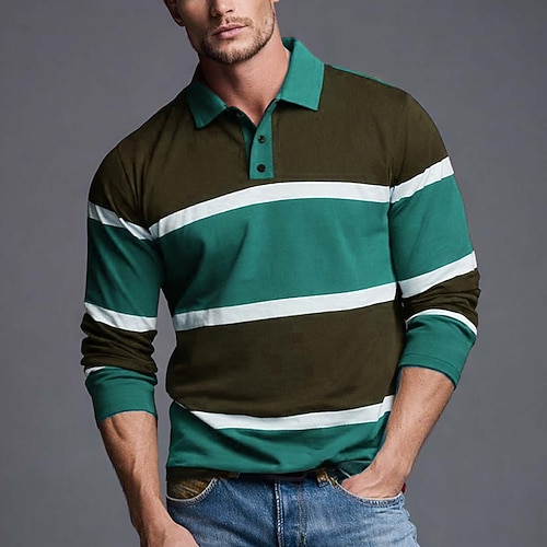 Herren Gestreift Waffel-Poloshirts Langarm Polo-Shirts Hemden mit Kragen Vintage Athleisure Alltagskleidung 3D-Druck Knöpfe Frühling Herbst Blau Rote Grün