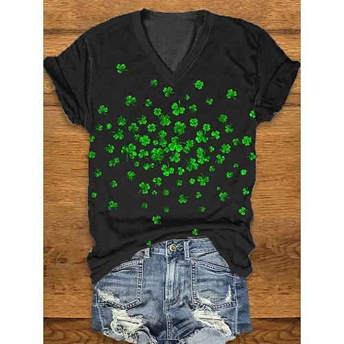 Maglietta da donna portafortuna per il giorno di San Patrizio, grafica, trifoglio, vintage, elegante, classica, manica corta, scollo a V, top normali, stampa quotidiana, nero, bianco, estate,