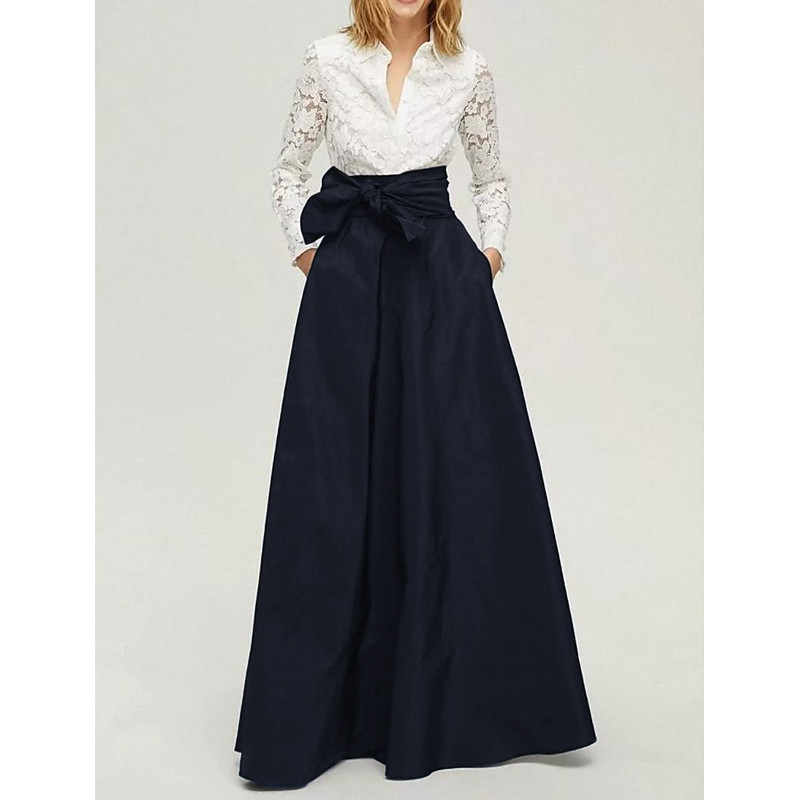 A-Line Floor Length Wedding Guest Dress Formal Dresses Evening Gown Mother of the Bride Dress Long Sleeve Shirt Collar Elegant Simple Minimalist Formal Wedding Guest Lace Stretch Satin with Bow(s)