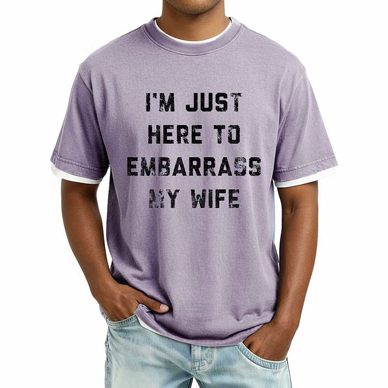 Im Just Here To Embarrass My Wife Funny Saying Men Graphic Tee Washed Cotton Blend Retro Blue Ringer Tshirt Humorous Prank Husband Gift Clothing Apparel S M L XL XXL XXXL