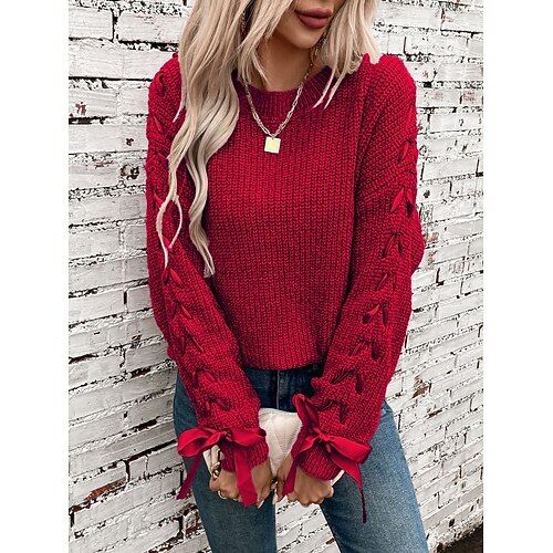 Per donna Felpa Casual Morbido Colore Puro A Coste Girocollo Patchwork Lavorato a maglia Manica Lunga Top Regolari Maglia All'aperto Quotidiano Weekend Rosa Vino Autunno Inverno