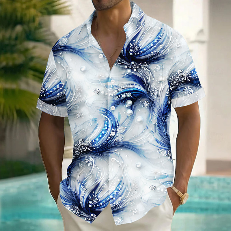 Men's Geometric Waves Pearl Shirt Summer Shirt Button Up Shirt Short Sleeve Fashion Casual Vacation Holiday Streetwear Summer Turndown 3D Print Front One Pocket Linen Like Shirt Blue Green Khaki