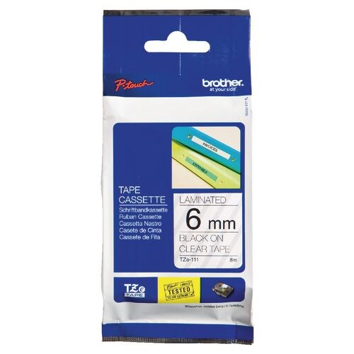 Brother TZe-111 Authentic Schriftband Selbstklebend Schwarzer Druck auf Transparent 6 mm x 8m