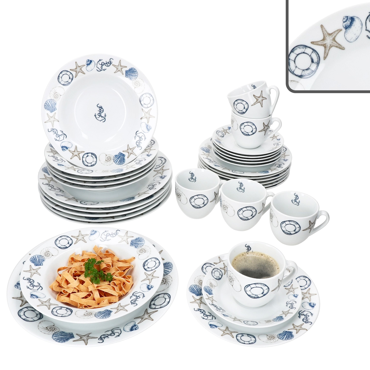 Neptun 30tlg Kombiservice Porzellan maritim Motive blau Anker Teller Tassen