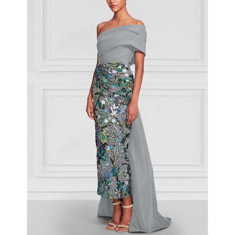 Sheath Column Floor Length Beaded Eembroidered Formal Dresses Mother of the Bride Dress Evening Gown Ball Gown with Overskirt Formal Dress Elegant Color Block High Split Short Sleeve Off Shoulder