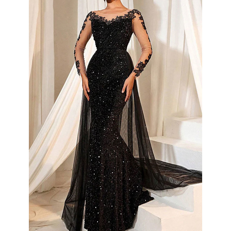 Mermaid Trumpet Floor Length Evening Gown Ball Gown with Overskirt Formal Dress Elegant Long Sleeve Crew Neck Prom Evening Party Tulle with Sequin