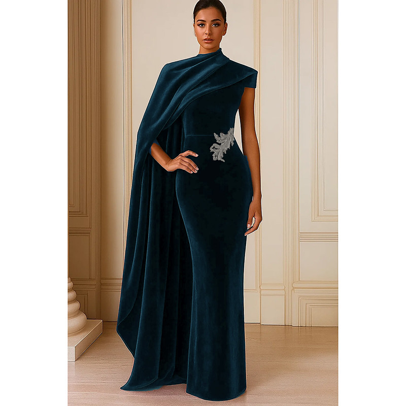 Mermaid Trumpet Sheath Column Floor Length Ball Gown with Cape Evening Gown Formal Dress Elegant Vintage High Split Sleeveless Illusion Neck Wedding Formal Sequined Velvet with Ruched Beading