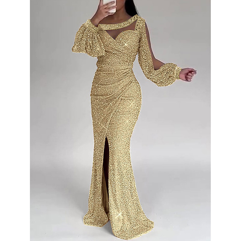 Mermaid Trumpet Sweep Brush Train Prom Dresses Evening Gown Ball Gown Formal Dress Party Long Sleeve Scoop Neck Formal Sequined with Glitter Ruched Slit
