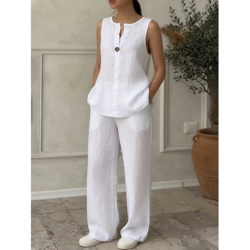 Per donna Set di Pantaloni Finto cotone e lino Senza Maniche Manica Corta Scollo a V Tinta unica Moda Streetwear Casuale Quotidiano All'aperto Blu Bianco Giallo Primavera Estate Vestibilità comoda