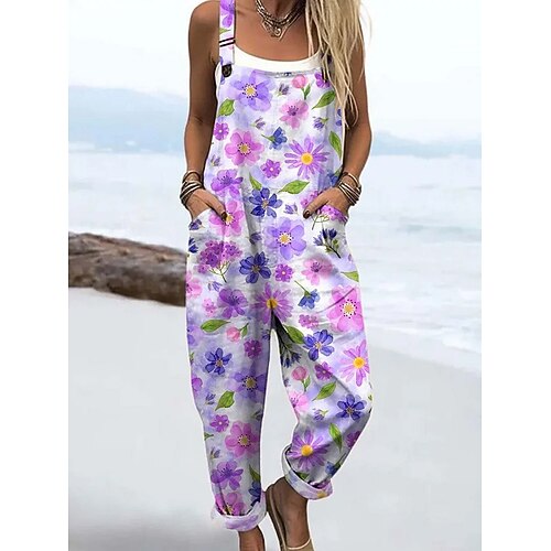 Per donna Tuta Attivo Floreale Senza Maniche Senza maniche Collo quadrato Tasca Stampato Quotidiano Spiaggia Vestibilità comoda Rosa Rosa polverosa Viola Estate