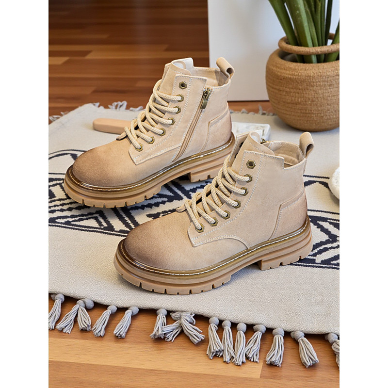 Women's Beige Chunky Heel Ankle Boots – Lace-Up Combat Boots with Side Zipper for Fall, Streetwear Daily Outfits