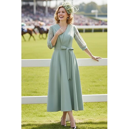 Linea ad A Lunghezza alla caviglia Abito Derby Abito da cerimonia per signora Manica 3/4 Scollo a V Bavero Elegante Derby del Kentucky Crepe Elasticizzato con Fiocco/Fiocchi