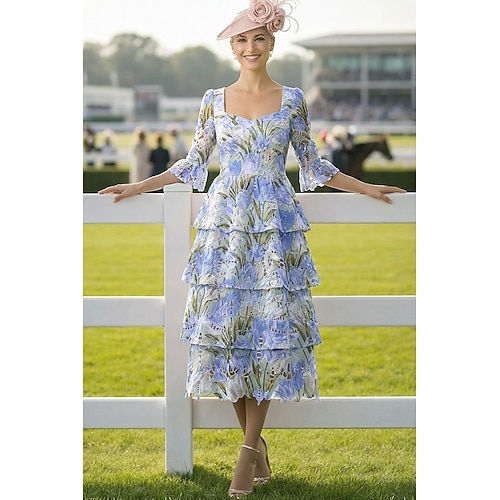 Linea ad A Lunghezza Tè Abito a Strati Abiti da Cocktail Elegante Floreale Manica 3/4 Scollo a Cuore Festa in giardino Matrimonio Pizzo con Stampa floreale Ricamo
