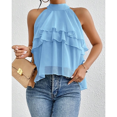 Per donna Canotta Maglietta Tinta unica Elegante Moda Senza Maniche Collo Alto Top Regolari Quotidiano Uscire Weekend Volant Nero Blu marino Azzurro cielo Viola Verde Estate Primavera