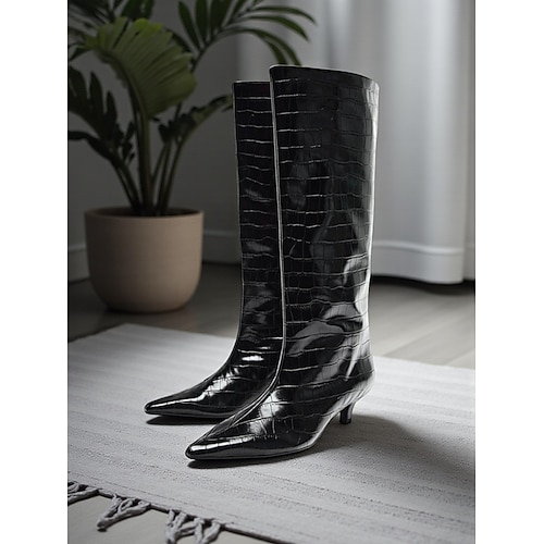 stivali alti fino al ginocchio da donna con stampa coccodrillo nera e tacco a gattino - punta affusolata e liscia, stile elegante per la sera eventi formali