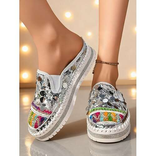 Sneakers da donna con plateau e paillettes - scarpe da festa slip-on glitterate con ricami colorati per outfit da sera, club e festival