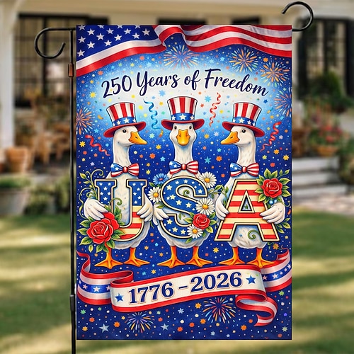 Bandiera da giardino per il 250° anniversario degli Stati Uniti, anatre celebrative, cappelli e papillon a tema USA, spettacolo pirotecnico vivace, decorazione patriottica ideale.