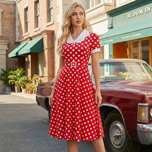 Rockabilly Midi Abito a trapezio Maniche corte Pois Aderente Svasato Costume Per donna Carnevale San Valentino Casuale Ritorno a casa Festa a tema retrò Adulti Vestito Primavera