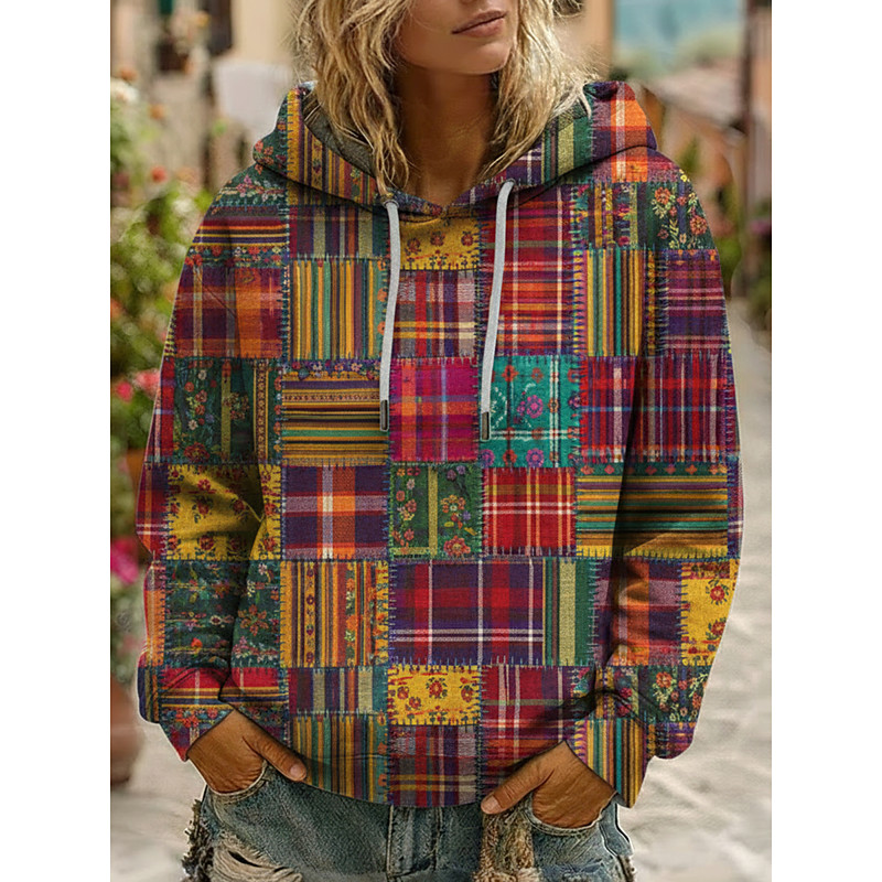 Women's Pullover Hoodies Plaid Fashion Streetwear Long Sleeve Hooded Regular Tops Dailywear Casual Drawstring Print Red Spring Fall