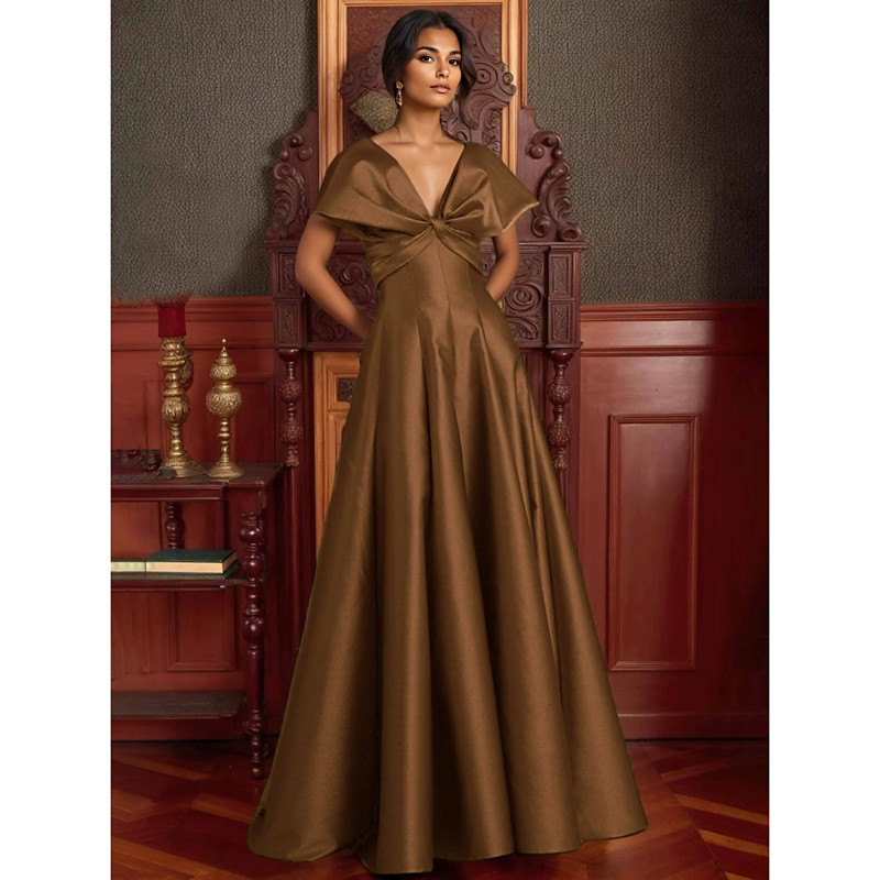 A-Line Floor Length Prom Dresses Evening Gown Ball Gown Formal Dress Elegant Short Sleeve V Neck Wedding Formal Capes Lurex Fabric with Glitter Pleats