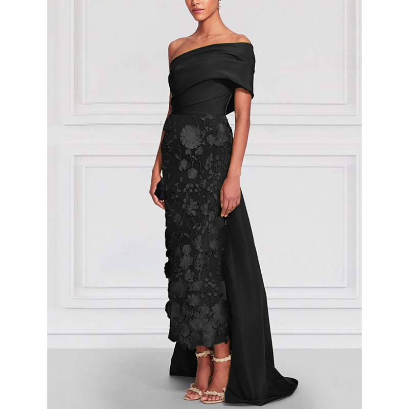 Sheath Column Tea Length Cocktail Dresses Evening Gown Ball Gown with Overskirt Formal Dress Elegant Sleeveless Off Shoulder Garden Party Wedding Satin with Bow(s) Embroidery