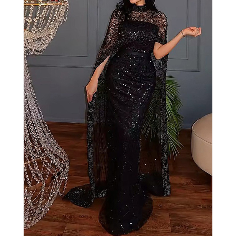 Sheath Column Floor Length Ball Gown with Cape Evening Gown Formal Dress Elegant Glittering Long Sleeve High Neck Wedding Formal Capes Sequined with Glitter