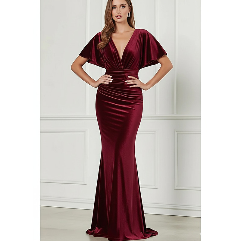 Mermaid Trumpet Floor Length Prom Dresses Evening Gown Ball Gown Formal Dress Elegant Short Sleeve V Neck Wedding Formal Velvet with Pleats