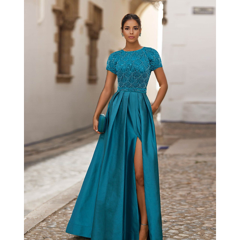 A-Line Floor Length Evening Gown Ball Gown Formal Dress Elegant Vintage Glittering Short Sleeve Jewel Neck Formal Pocket Satin with Rhinestone Glitter Slit