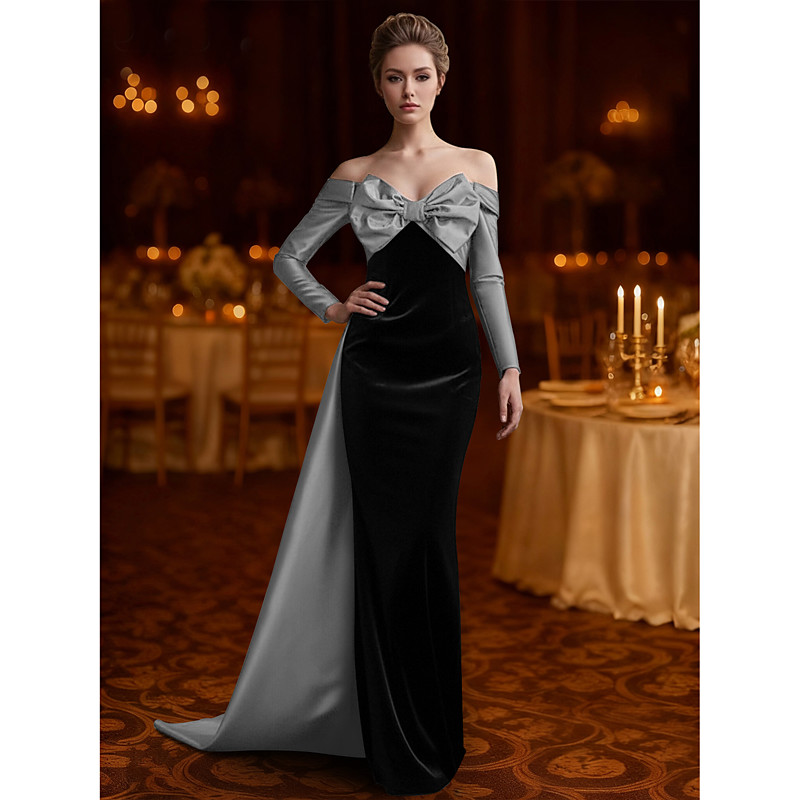 Sheath / Column Evening Sweep Brush Train Ball Gown with Cape Evening Gown Elegant Vintage Red carpet Sleeveless Off Shoulder Formal Black Tie Gala Satin Velvet with Bow(s)