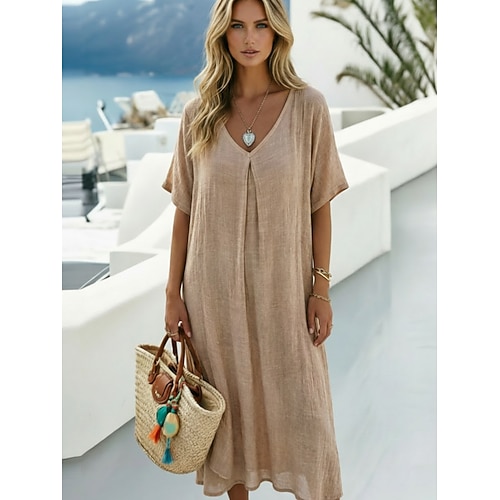 Per donna Abito Midi Abito in cotone e lino Moda Moderno All'aperto Vacanza Ferie Vestibilità comoda Semplice Manica Corta Scollo a V Blu Reale Arancione Verde Rosso rosa Estate Primavera