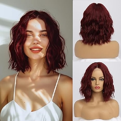 Parrucca Corto Ondulata per Donne 14 Pollici Lunghezza Spalla Divisione Centrale Riccia Senza Pizzo Parrucca Bob Ondulata Parrucca Sintetica Resistente al Calore dall'Aspetto Naturale per Uso