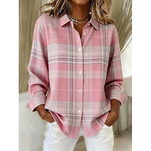 Per donna Camicia Blusa Plaid Casual Manica Lunga Colletto a Camicia Top Regolari Quotidiano Patchwork Bottoni Stampato Blu Nero Rosa Rosso Blu turchese Autunno Inverno
