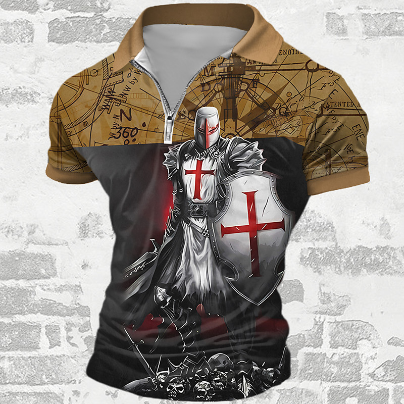 Men's Knights Templar Zip Polo Shirts Golf Shirt Short Sleeve Polo Shirts Collared Shirts Vacation Wear Festival Wear Party Outfits 3D Print Quarter Zip Polo Summer Spring Black