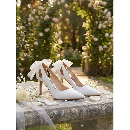 scarpe da donna con tacco alto, punta a punta color champagne e fiocco - eleganti décolleté da sposa per matrimoni in città