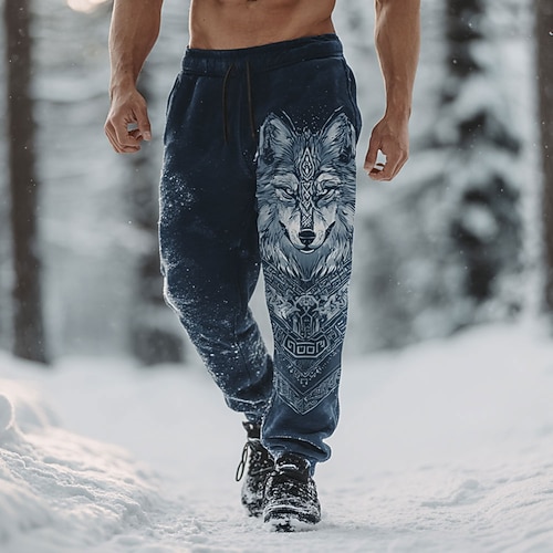 Herren Anime Wolf Wikinger Jogginghose Hose Mittlere Taille Kordelzug Elastischer Bund Vintage-Retro Outdoor Campen und Wandern Jagd Sportliche Jogginghose mit Taschen Herbst Winter 3D-Druck Blau