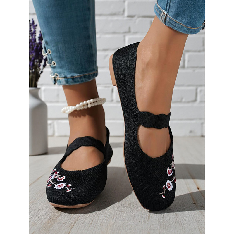 Women's Beige Flyknit Mary Jane Flats with Floral Embroidered, Casual Breathable Slip-On Shoes for Work, Travel and Daily Wear