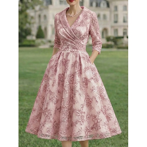Linea ad A Abito Lunghezza alla caviglia Lunghezza Tè Abito da Cocktail Abito da cerimonia per signora Manica 3/4 Scollo a V Bavero Elegante Lussuoso Casual Formale Ospite di nozze Semi-Formale Pizzo