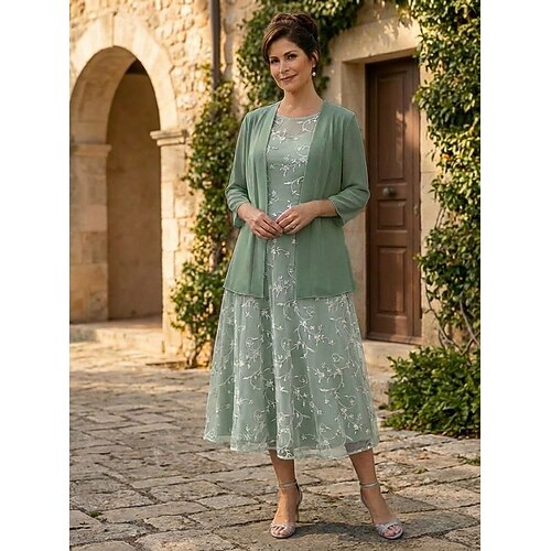 Due Pezzi Linea ad A Lunghezza Tè Abito da invitata a nozze Abito da cerimonia per signora Senza Maniche Manica 3/4 Girocollo Elegante Semplice Minimalista Formale Semi-Formale Chiffon Jacquard con