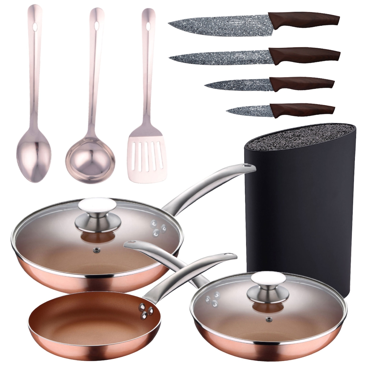 San Ignacio - 3er-Set 20/24/28 cm Bratpfannen aus gepresstem Aluminium für Induktion mit Utensilien- und Messerset Energy+