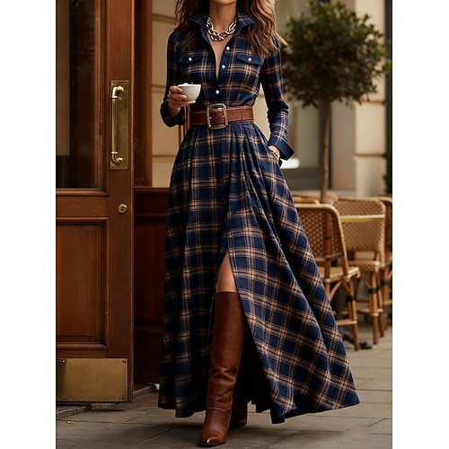 Per donna Abito maxi Abito a Tubino Vacanza Casual Boho Quotidiano Vestibilità regolare Plaid Manica Lunga Colletto a Camicia Blu Giallo Rosa Rosso Primavera Autunno Inverno