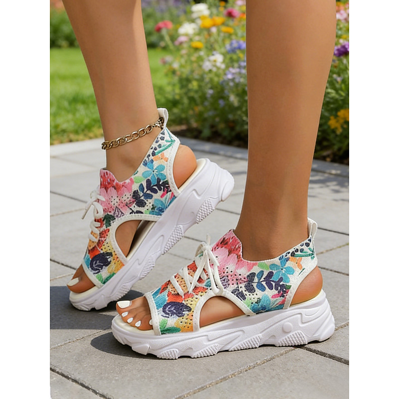 Women's Colorful Floral Print Platform Sandals - Lace-Up Open-Toe Sneaker Sandals for Summer Outings, Walking and Casual Vacation