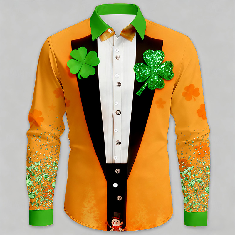 St. Patrick's Day Men's Four Leaf Clover Faux Collar and Suit Design Shirt Button Up Shirt Long Sleeve Fashion Casual Party Holiday Spring Fall Turndown 3D Print Collared Shirts Purple Orange Green