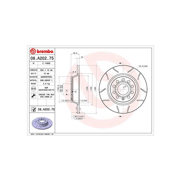 Jarrulevy Vakiomalli, Taka-akseli Brembo 08.A202.75 - audi, seat, skoda, vw - OE 1K0615601AD, 1K0615601M, 3CD615601