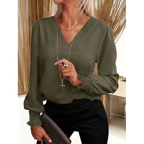 Per donna Camicia Blusa Semplice Casual Manica Lunga Scollo a V Top Regolari Ferie Uscire Arricciato Nero Bianco Rosa Vino Verde militare Estate Primavera