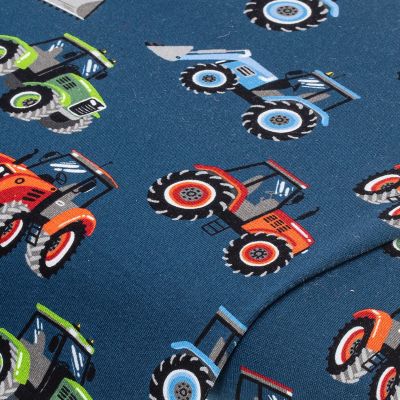 Tissu jersey de coton à impression numérique "tracteur" avec élasthanne, bleu foncé/coloré