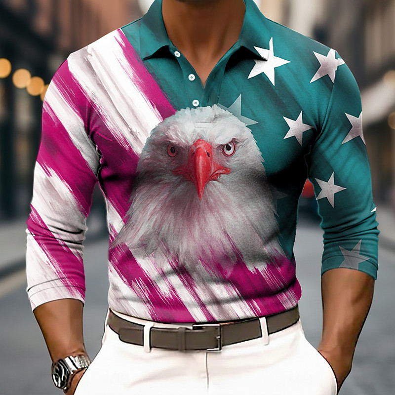 American Independence Day Men's American US Flag Eagle Polo Long Sleeve Polo Shirts Lapel Casual Outdoor Athleisure Daily Wear 3D Print Buttons Spring Fall Winter Blue Green