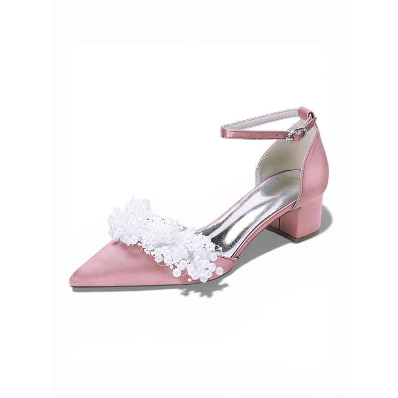 Women's Elegant Pink Satin Bridal Heels with Flower Embellishments – Perfect for Garden Weddings, Bridesmaids Shoes with Ribbon Straps and Low Block Heels