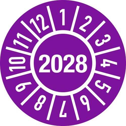 Dreifke® Prüfplakette Jahr 2028 mit Monaten, Folie, Ø 15 mm, 10 Stück/Bogen
