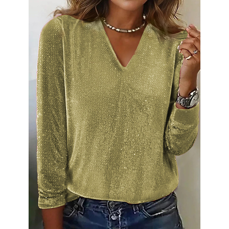 Women's Shirt Blouse Plain Basic Modern Long Sleeve V Neck Regular Tops Daily Holiday Sequins Silver Black Yellow Pink Red Summer